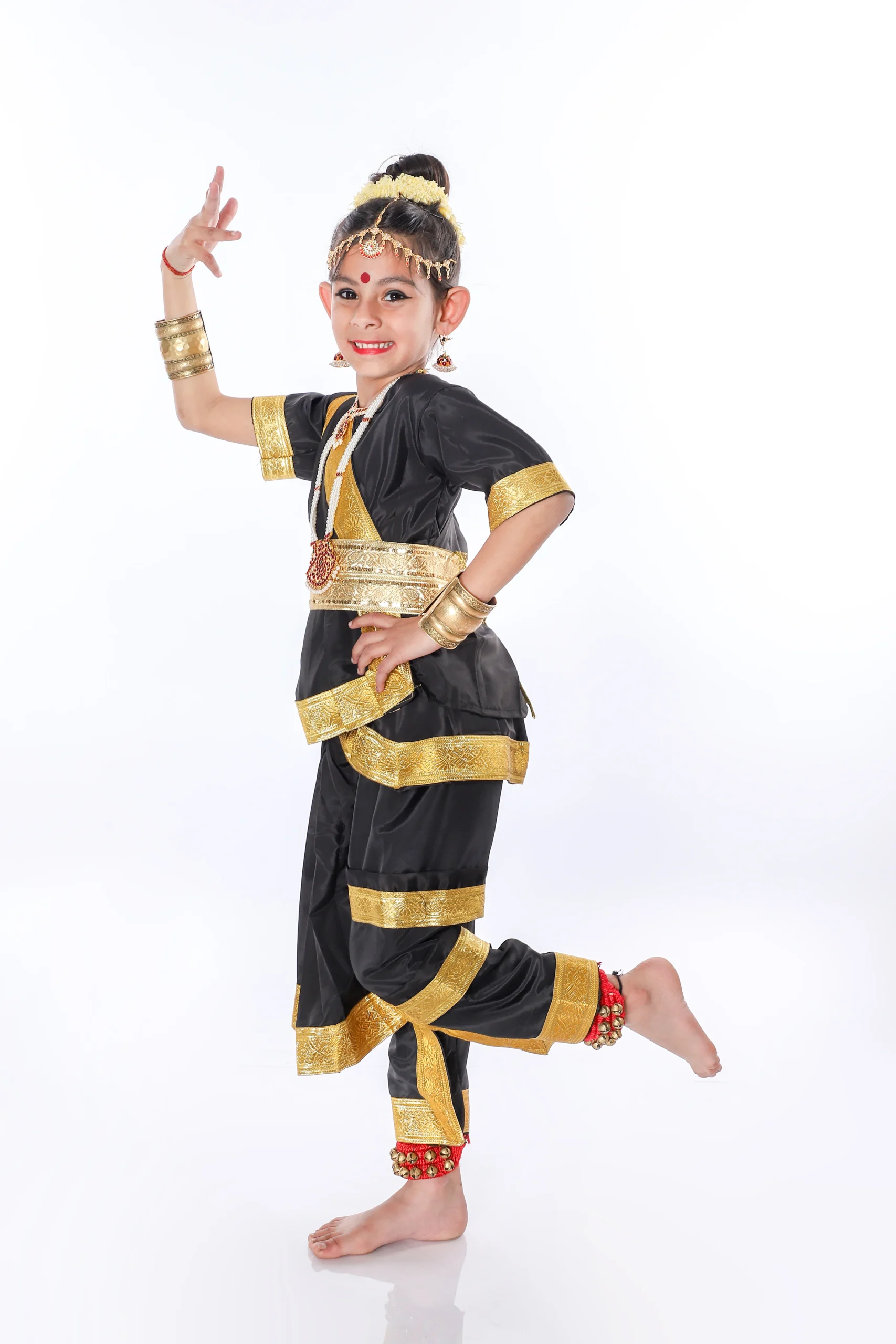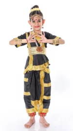 Buy Online Beautiful Indian Bharatnatyam Dance Fancy Dress Costume in Black with Golden Border costume. This Traditional Bharatanatyam costume, Pallu stitched as the front and opens up like a beautiful fan. This costume is specially designed for Bharatanatyam dance and fabulous Black and Golden color combination of saree and uses silk fabric.