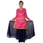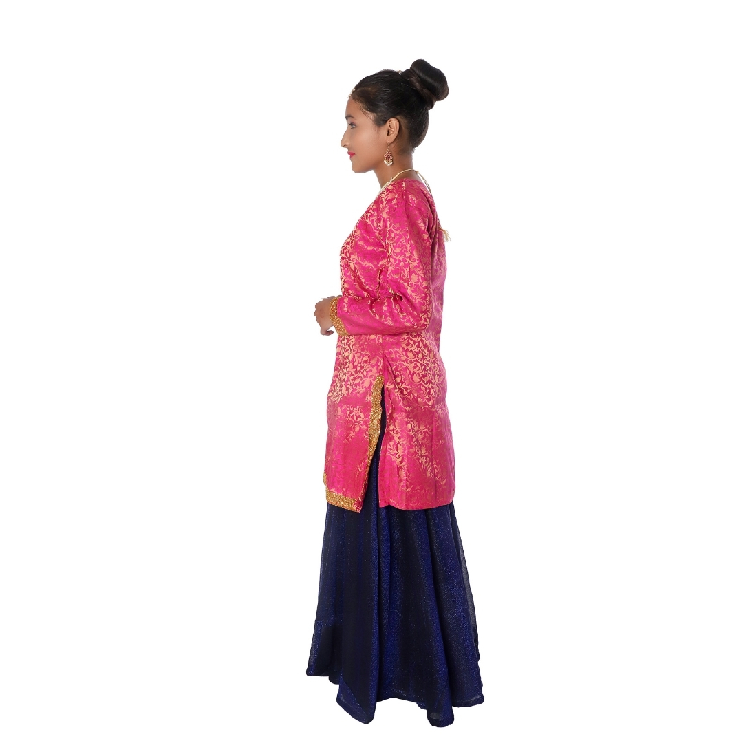 Contemporary and Indo Western Dance Fancy Dress Costume for Girls blends tradition with modern elegance. This vibrant costume, featuring magenta and blue color, is designed for cultural events, talent shows, and dance competitions, showcasing grace, flexibility, and individuality in various dance forms like Bollywood, contemporary, and Indo-Western fusion.