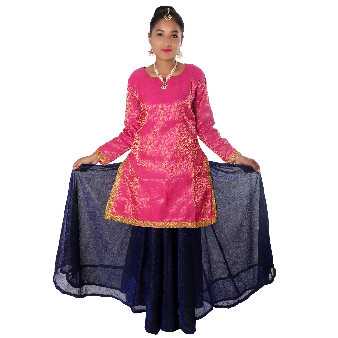 Buy online Contemporary And Indo Western Dance Fancy Dress Costume Skirt and Top for girls. This costume is specially made from Jhilmil Lycra & Brocade material and a beautiful color combination of Magenta and Blue. It has evolved to take many different forms depending on the country and region, both in costume and dance style. This costume is specially designed for Contemporary,