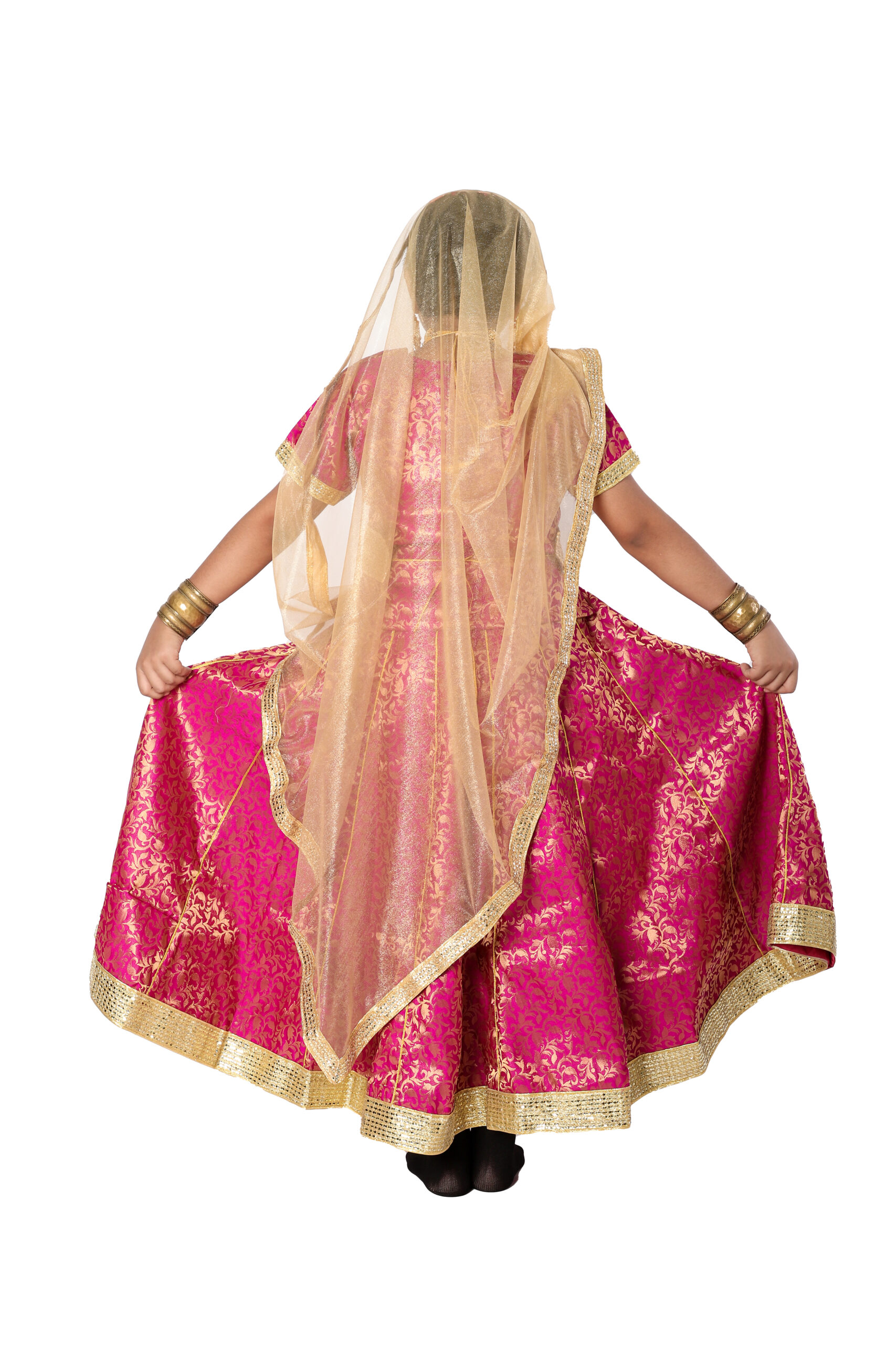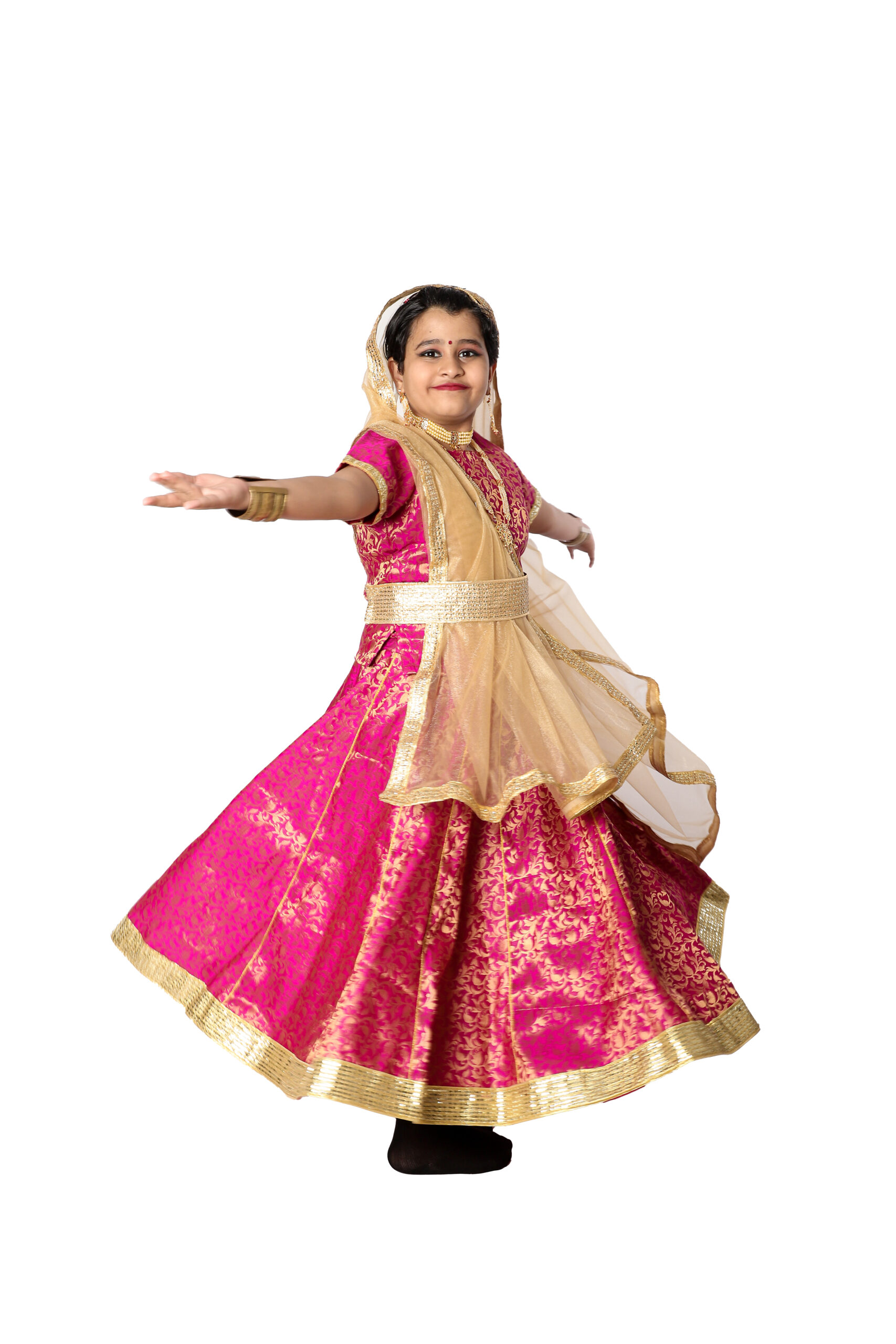Buy Online Kathak Fancy Dress Costume For Classical Dance. This costume is specially designed for Kathak dance and a crucial part of any performance. This costume is specially designed for Kathak dance and fabulous Magenta and Golden color combination. This dancing dress is comfortable in wearing and Symernate and chanderi brocade Material is used. This costume can be worn by girls in school functions, Kathak dance, international state level dance competitions and cultural programs.