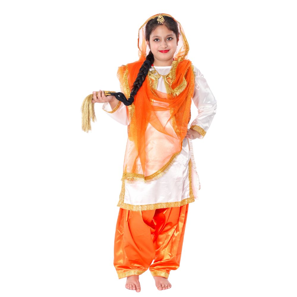 Buy Online Punjabi Gidda Dance Fancy Dresses for Girls. This costume is specially designed according to Gidda, it is the traditional dance of women originating from the state of Punjab. Giddha Dance Dress, Gidda (Punjabi) Dance Costume. This costume uses Brocade & Heavy Satin material fabric. This costume is designed for a girl to wear in school functions, fancy dress competitions, Dance competitions, Baisakhi festival along with during weddings and New Year celebrations.