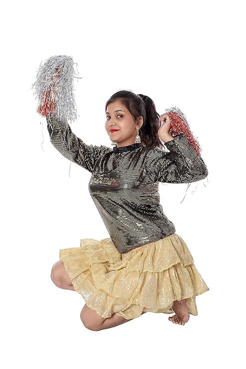 Buy online Western Dance Fancy Dress Costume Skirt and Top in Golden & Black for girls. This costume especially uses Zero bindi shimmer material and beautiful color combination white and blue. It is perfect for group dance shows as well and the sequin designing along with the shining material gives the perfect look. Dress your girl as a superstar like Shakira, Jenifer Lopez or a Britney Spears. This costume is designed for pop-dance for girls in function and competition.