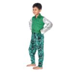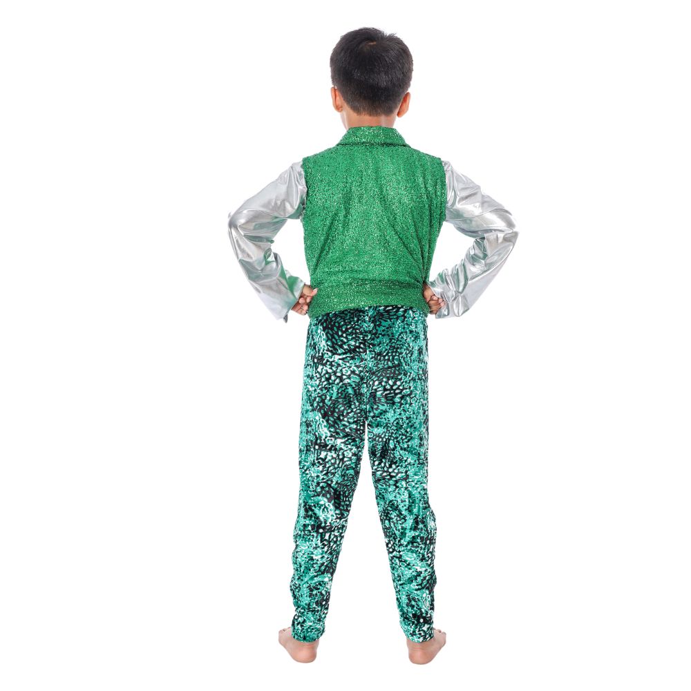Buy online Western Dance Fancy Dress Costume in Green & Silver for boys. Khichdi and Lycra velvet tiger print material used this costume. Its include a beautiful color combination white shining shirt and green tiger print trouser with a green color jacket. We always wanted to take part in fancy dress competitions. This costume is designed for boys to wear in school functions, fancy dress competitions, dance competitions, and festivals.