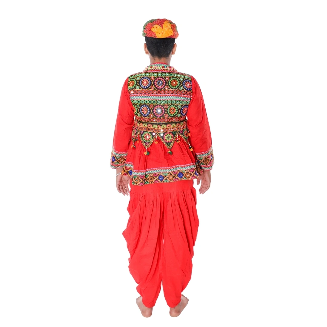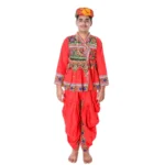 Buy Online Garba Dance Fancy Dress Costume for Boys traditional ethnic royal fashion cotton Turban, Angrakha & Dhoti will surely give you royal look in every occasion. The neck and sleeves are adorned with intricately printed laces. The stylish Dhoti in red color enhanced with print Jaipuri multicolor laces border. This costume is specially designed according to Gujrat’s famous Garba dance and this product use multicolor Turban, Chanderi Print Angrakha, and heavy Satin Dhoti dress can be worn in all family functions. For School Annual function/Theme Party. Purchase Gujarati Fancy Dress Direct from Fancy Dress & Costume Manufacturer/ Exporter based in Delhi NCR, India. Red in color for all sizes.Comfortable in wearing and pure cotton material is used which is more durable.Washcare – Drycleaning.