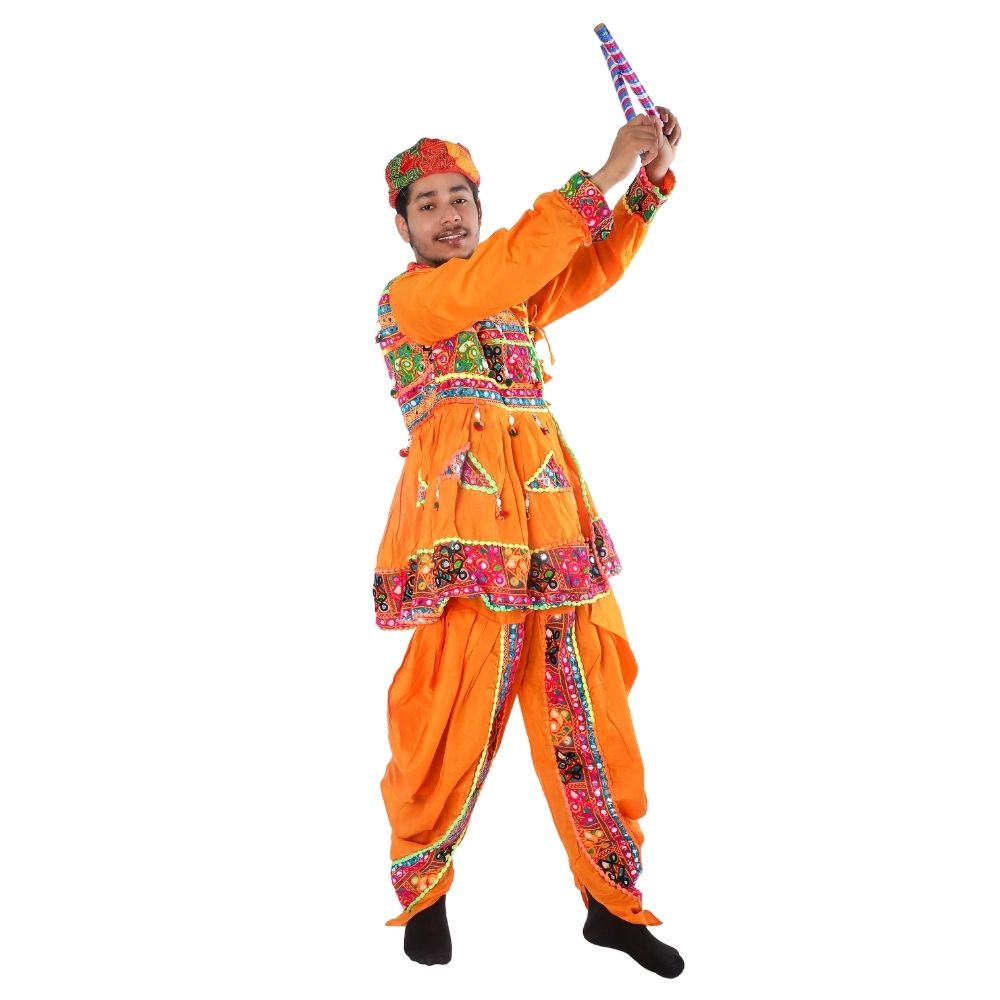 Buy Online Gujrati Dance Fancy Dress Costume for Man traditional ethnic royal fashion cotton Turban, Angrakha & Dhoti will surely give you royal look on every occasion. The Costume is adorned with intricate designs. This product includes multicolor Turban, Yellow Angrakha and, Dhoti. This Costume is made from Cotton Fabric.