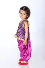 Buy Online Indo Western Fancy Dress Costume in Purple & Golden for boys. This dress is a combination of Purple jacket and Pink salwar. This costume uses Brocked Heavy Satin fabric. Jacket with Sequin Work, Arabian Harem-Style Pants / Balloon Pants (Purple) with Contrasting Belt Color. It is perfect for group dance shows as well, and the sequin designing along with the shining material gives it the perfect look. This costume is designed for boys to wear in school functions, Indo western dance fancy dress competitions, dance competitions, and festivals.