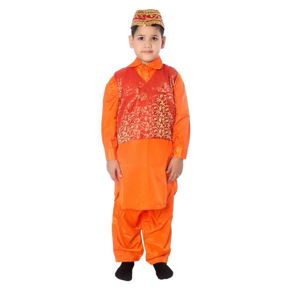 Buy Online Kashmiri Traditional Dress with Cap for boys includes a beautiful Color combination of Red And Orange. This costume is specially designed according to Kashmir’s famous Kashmiri dance. We always wanted to take part in fancy dress competitions. This costume boys can wear this Kashmiri costume in school functions, Indian State theme fancy dress competitions, and group dance. The costume is available in different sizes and red colors for all age groups of boys. Chairman And Brocade fabric used for this costume.