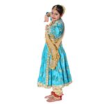 Buy Online Beautiful Kathak Angrakha Style Dance Fancy dress Costume (Blue & Golden) for Girls. This Traditional KATHAK Dance in Angrakha Style Blue color and Duppata & churidar in Golden. This dress is a combination of Blue and Golden and Brocaked fabric is used. This costume is designed for girls to wear in Kathak dance.