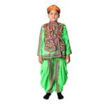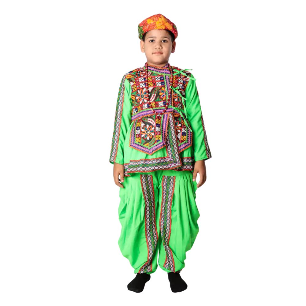Buy Online Kediya Garba Dance Fancy Dress Costume for Boys includes traditional ethnic royal fashion cotton Turban, Angrakha & Dhoti will surely give you royal look in every occasion. The neck and sleeves are adorned with intricately printed laces. The stylish Dhoti in red color enhanced with print Jaipuri multicolor laces border. This costume is specially designed according to Gujrat’s famous Garba dance, For School Annual function/Theme Party.