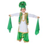 Kids Bhangra Dance Dresses for Boys Green And White by Sanskriti Fancy Dresses captures the lively essence of Punjab’s traditional Bhangra dance. This ensemble includes a brightly colored kurta, Lungi, complete with a regal turban or pagri.