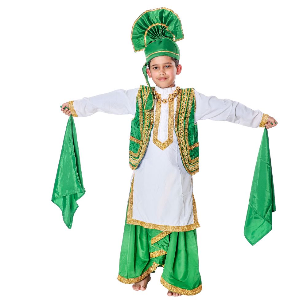 This costume is specially designed according to the Punjabi famous Bhangra Dance. This costume is designed for boys to wear in school functions, fancy dress competitions, dance competitions, and festivals. The costume is available in different sizes and green color for all the age group of boys. Purchase Bhangra Dance Fancy Dress Costume Direct from Fancy Dress & Costume Manufacturer/ Exporter based in Delhi NCR India. The costume is available in different sizes for all age groups.
