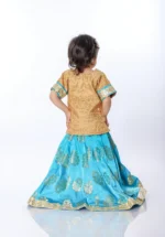 Buy online Kids Lehenga Fancy Dress Costume for girls. This dress includes a lehenga with choli. Your little kids looking is very pretty. This Costume whole dress is essentially Firozi in color with golden decorative laces. This costume wear for stage shows, school functions, and wedding party and family functions.
