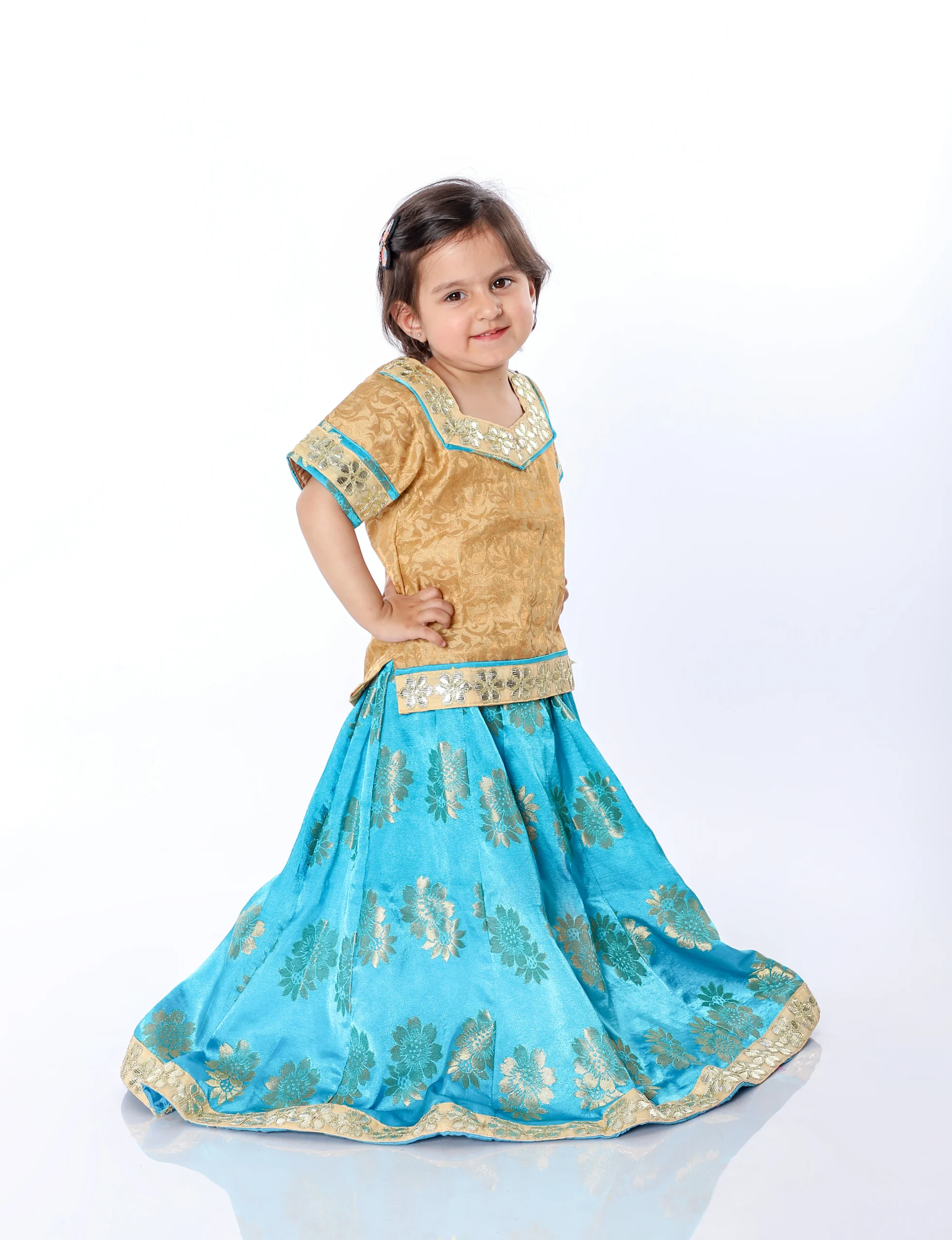 - This Kids Lehenga Costume whole dress is essentially Brocade fabric Firozi in color with golden decorative laces.