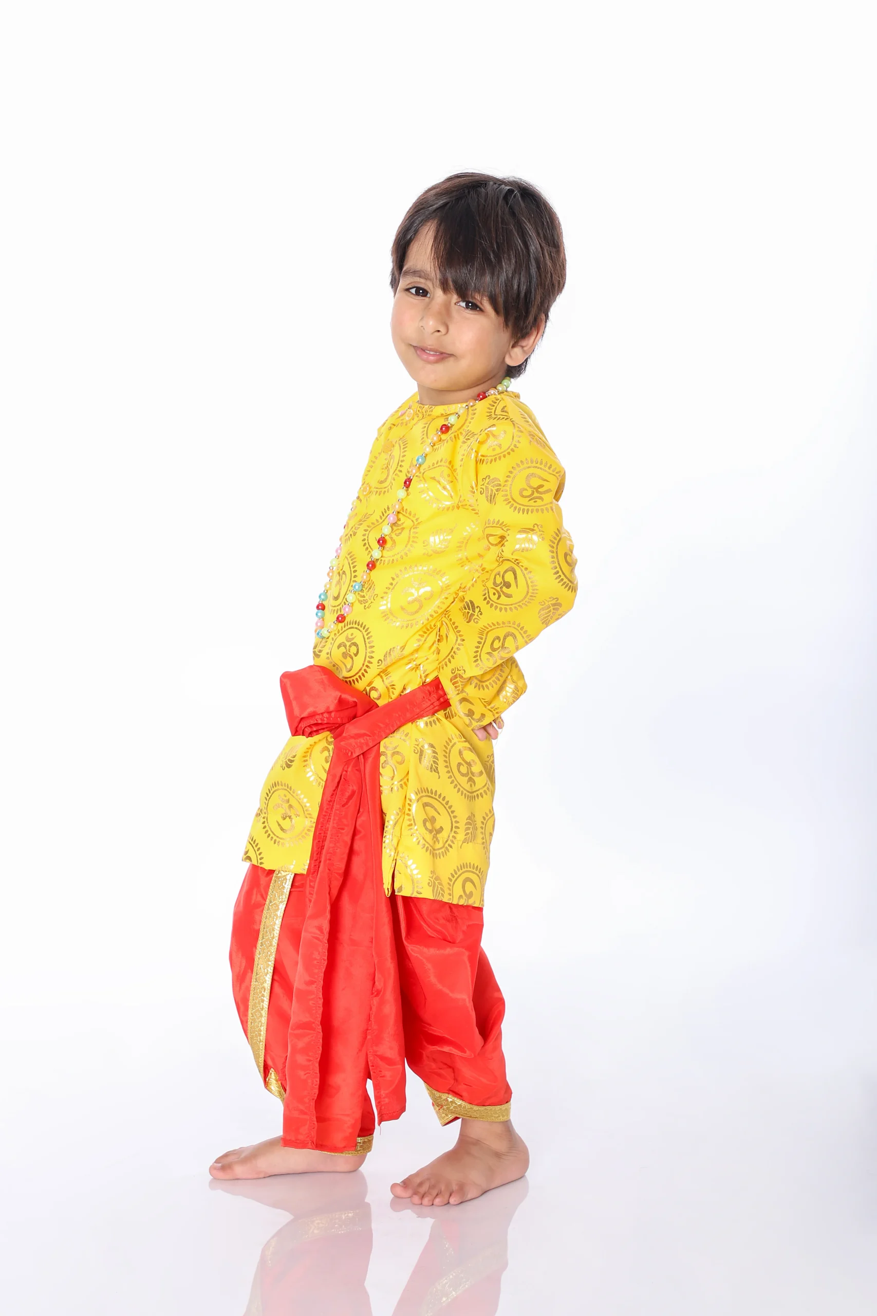 Krishana Fancy Dress Costume for Kids. Krishna Costume dress is the most popular dress for kids in India, Every kid wears this costume at least once in his childhood. The costume includes a Yellow Kurta and dhoti, Baju band, Patka, Flute, Kundal, and a Crown. This costume is specially designed for boys who want to play the role of Krishan Janmashtami in school functions, fancy dress competitions, Indian state theme competitions or role model presentations. It is yellow in color.