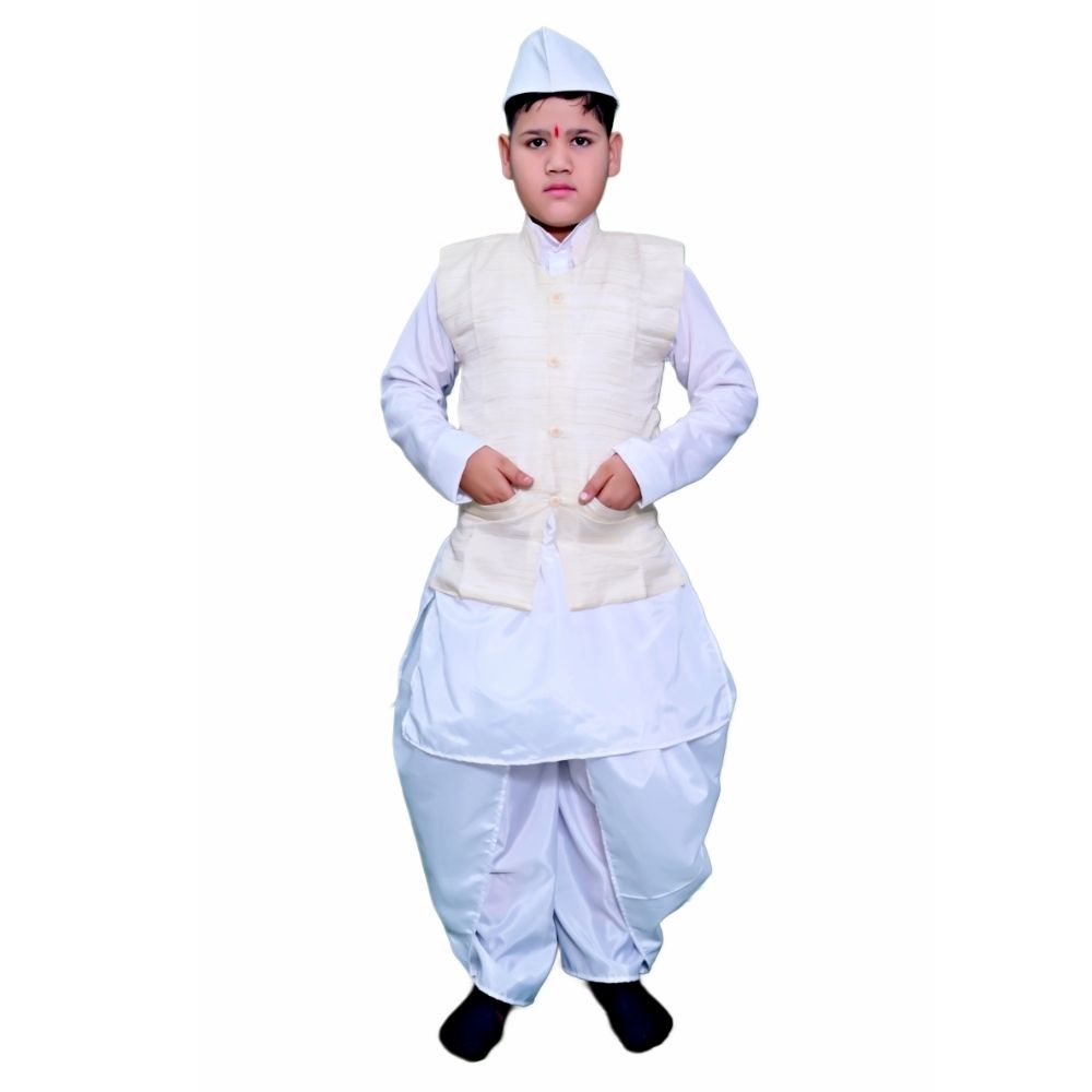 Dress your child in the spirit of patriotism with our Lal Bahadur Shastri Fancy Dress Costume. Made from high-quality Bengali silk and khadi, this dress features a classic white dhoti, kurta, and a stylish jacket, complete with a traditional Nehru cap. Perfect for cultural events, school functions, and fancy dress competitions, this costume is designed for comfort and ease of wear, allowing your little one to honor the legacy of one of India’s great leaders.