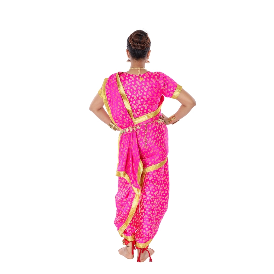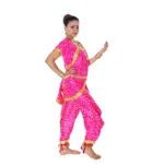 Buy online Beautiful Pink Lavani Saree Fancy Dress Costume made with heavy satin. This costume is specially designed according to Maharashtra’s famous Lavani Dance. The Lavani Saree Fancy Dress Costume dress is used on Independence Day, Republic Day to dress like Rani Laxmi Bai to do a stage dance. This costume wears this for doing the traditional Maharashtrian LAVNI or KOLI dance. The saree can also be used to dress your daughter on traditional family functions like Marriage, Engagement, Diwali, Great for fancy dress competitions, stage shows, school function drama, kids theme party, birthday party. Purchase Lavani Saree Fancy Dress Direct from Fancy Dress & Costume Manufacturer/Exporter based in Delhi NCR India. The costume is available in different sizes and beautiful color for all the age group of Girls.
