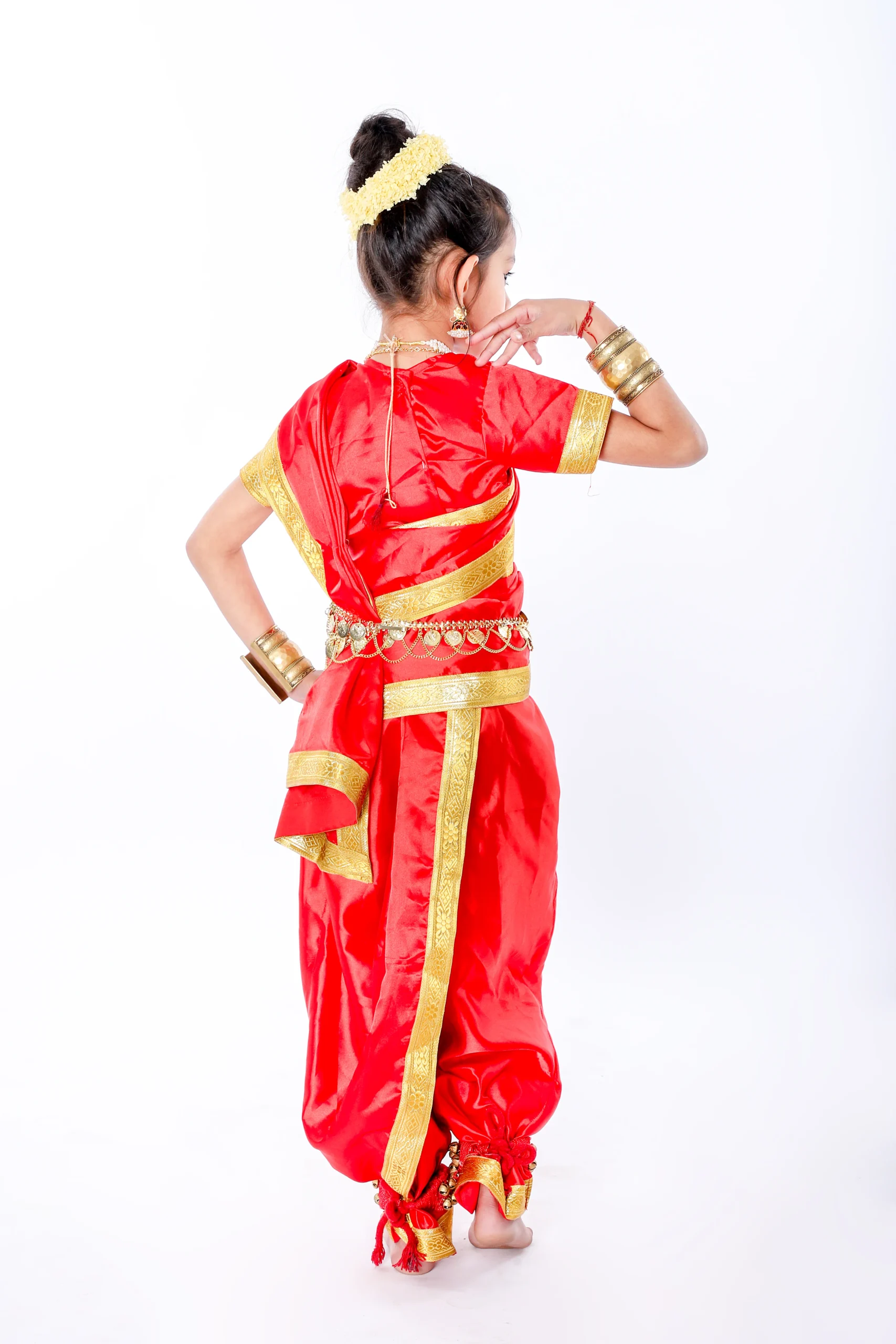Buy online Beautiful Red Lavani Saree Fancy Dress Costume made with heavy satin. This costume is specially designed according to Maharashtra’s famous Lavani Dance. The Lavani Saree Fancy Dress Costume dress is used on Independence Day, Republic Day to dress like Rani Laxmi Bai to do a stage dance. This costume wears this for doing the traditional Maharashtrian LAVNI or KOLI dance. The saree can also be used to dress your daughter on traditional family functions like Marriage, Engagement, Diwali, Great for fancy dress competitions, stage shows, school function drama, kids theme party, birthday party. Purchase Lavani Saree Fancy Dress Direct from Fancy Dress & Costume Manufacturer/Exporter based in Delhi NCR India. The costume is available in different sizes and beautiful color for all the age group of Girls.