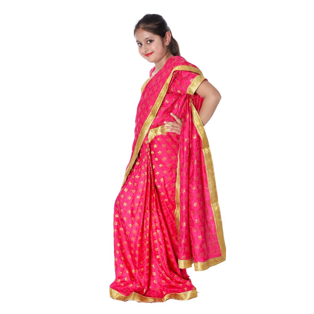 Buy Online Kids Saree Fancy Dress Costume Magenta for girls. This costume is specially designed for kids who want to play the role of Teacher in school functions, fancy dress competitions, Indian state theme competitions, or role model presentations. It is a beautiful color combination of Saree, blouse. Pink-colored Silk fabric with golden stripes is used to make this saree.