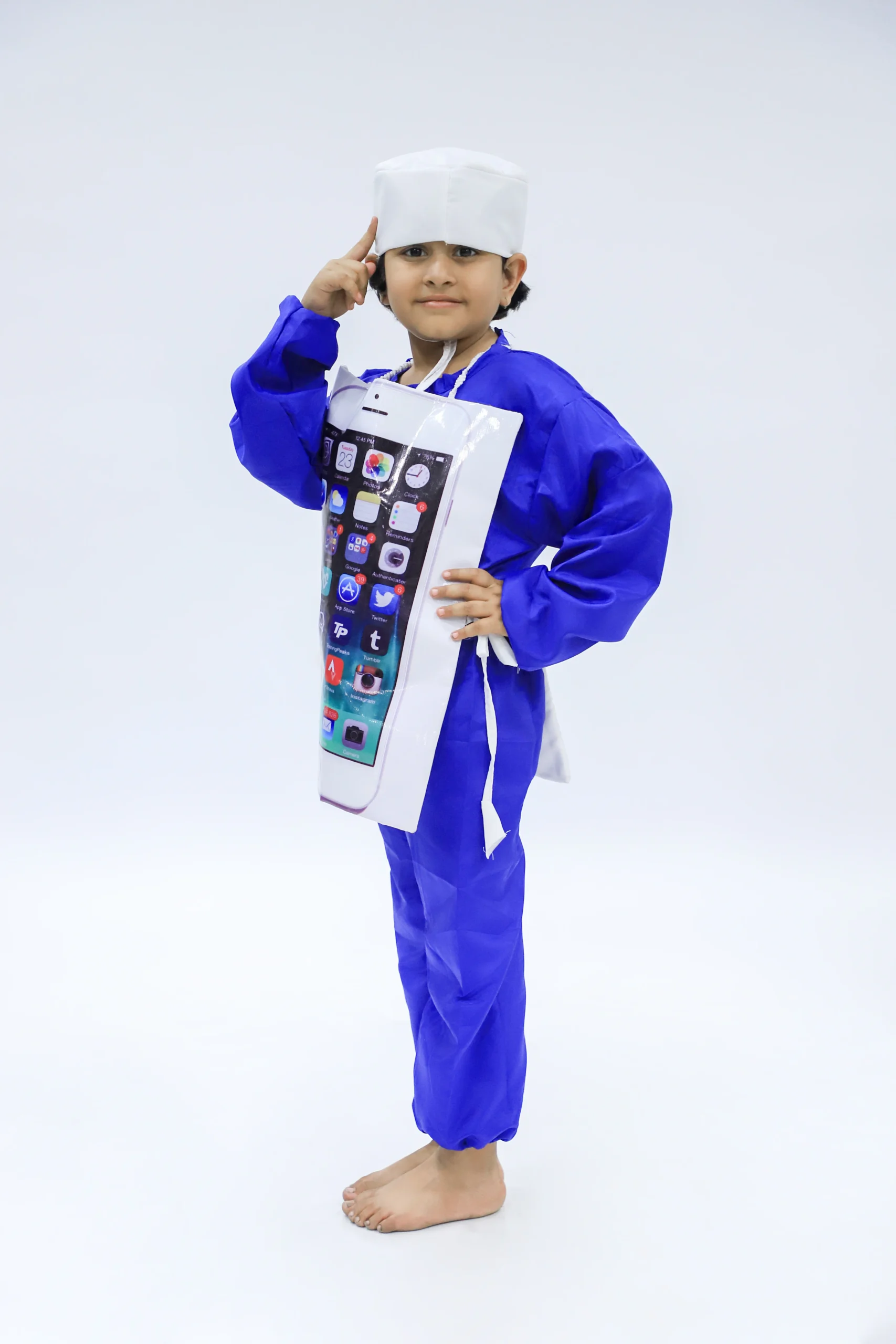 This costume used a white color chairman fabric. This costume wear in fancy dress competitions, stage shows, drama, kids’ theme parties, birthday parties. School functions etc. Purchase Mobile Fancy Dress Directly From Fancy Dress & Costume Manufacturer/Exporter based in Delhi NCR India. The costume is available in different sizes for all age groups of kids.