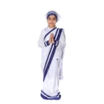 Buy Online Mother Teresa  Saree Fancy Dress Costume white saree with blue border for girls. This costume is specially designed for girls who want to play the role of Mother Teresa in school functions, fancy dress competitions, Indian state theme competitions, or role model presentations.