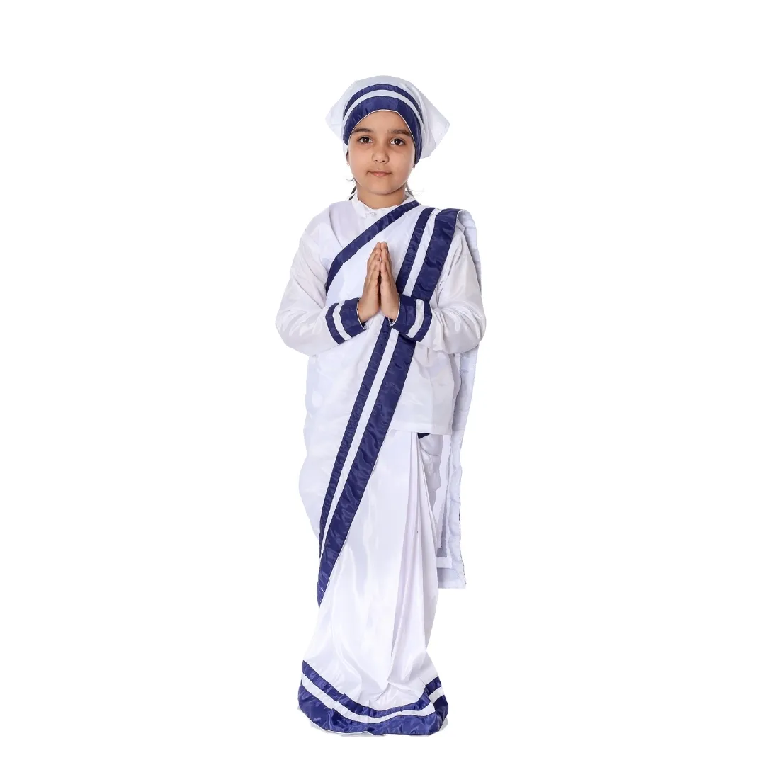 It is a combination of a Saree, blouse, and a handkerchief to cover the head. White-colored Chairman fabric with blue stripes is used to make this costume. Purchase Mother Teresa Saree Fancy Dress Costume Direct from Fancy Dress & Costume Manufacturer/Exporter based in Delhi NCR India. The costume is available in different sizes for all age groups of girls.