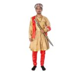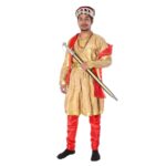 Buy Online Mughal King Fancy Dress Costume For Kids And Adults. This costume is specially designed for boys who want to play the role of King in school functions, fancy dress competitions, Indian state theme competitions, or role model presentations. It is a combination of a full-length dress with pyjama. Brocade and Chairman Fabric are used to make this costume.