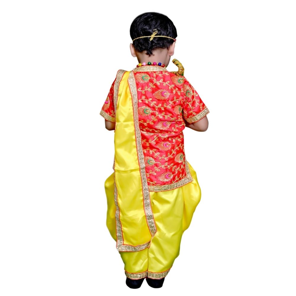 Transform your child into the Raja Ram with this stunning Mythological Character Raja Ram Fancy Dress Costume. Crafted from premium Gold coin embroidery fabric material and Satin, this costume features an intricately designed Angrakha, elegant Dhoti, majestic Mukut, traditional Patka, and decorative Mala. Perfect for cultural events, school functions, and fancy dress competitions, this costume will make your little one the center of attention.