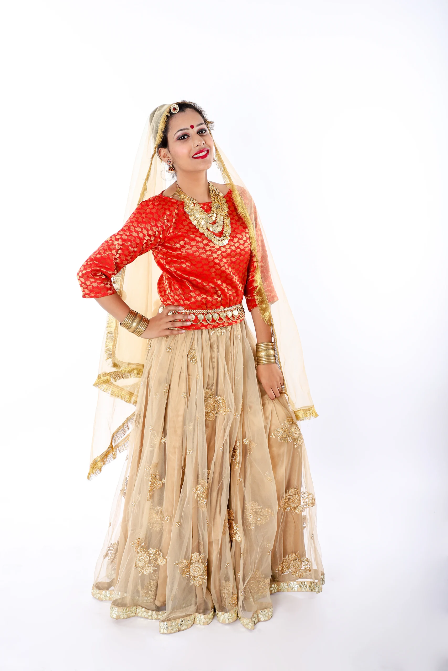 Buy online Beautiful Radha Rani Lehenga Fancy Dress Costume Red & Golden lehenga dress with red choli made in a light fabric with embroidered work. This lehenga choli made for a girl and comfortable in wearing for girls. Heavy satin and brocked materials used for this lehenga and full net dupatta.