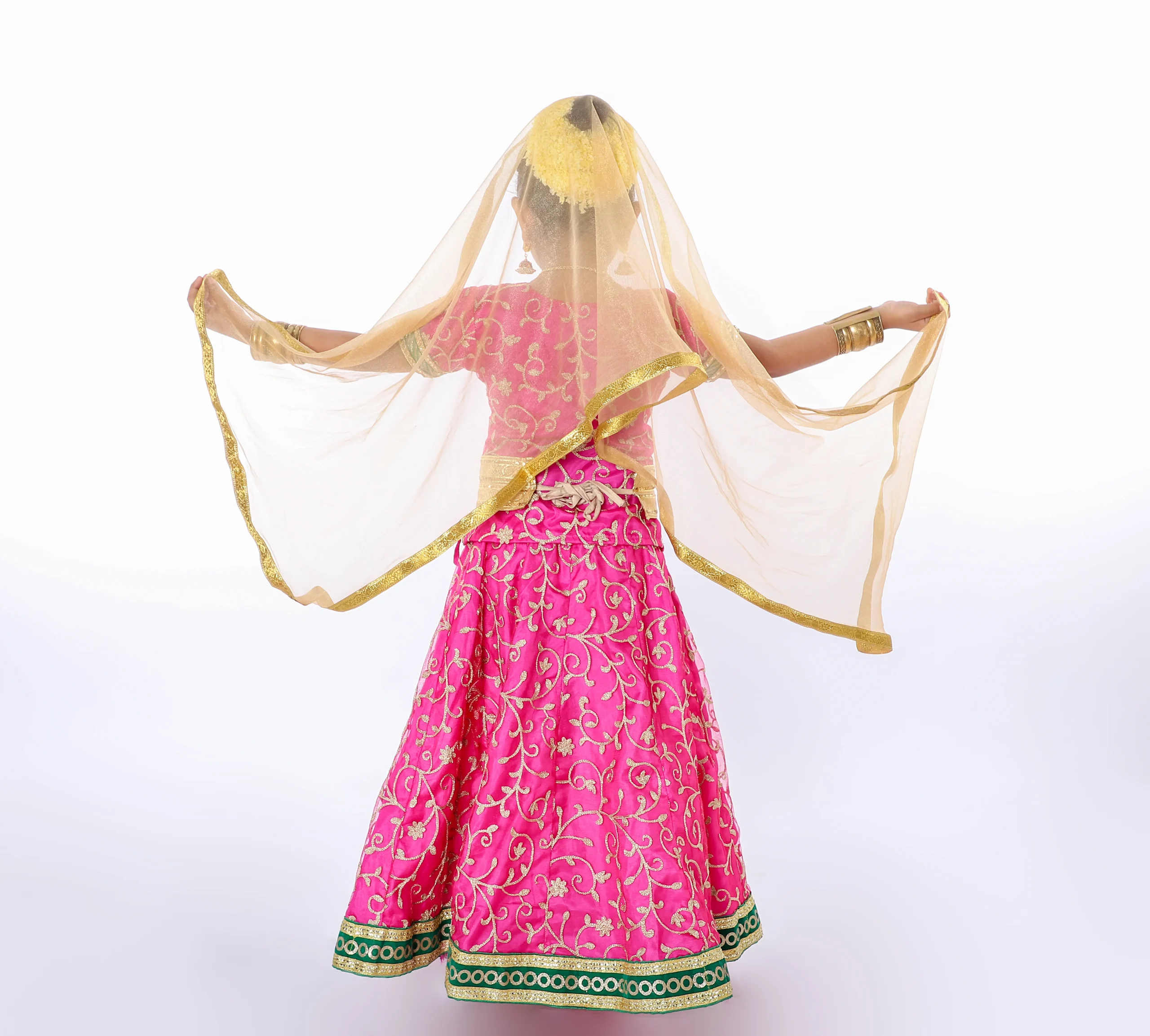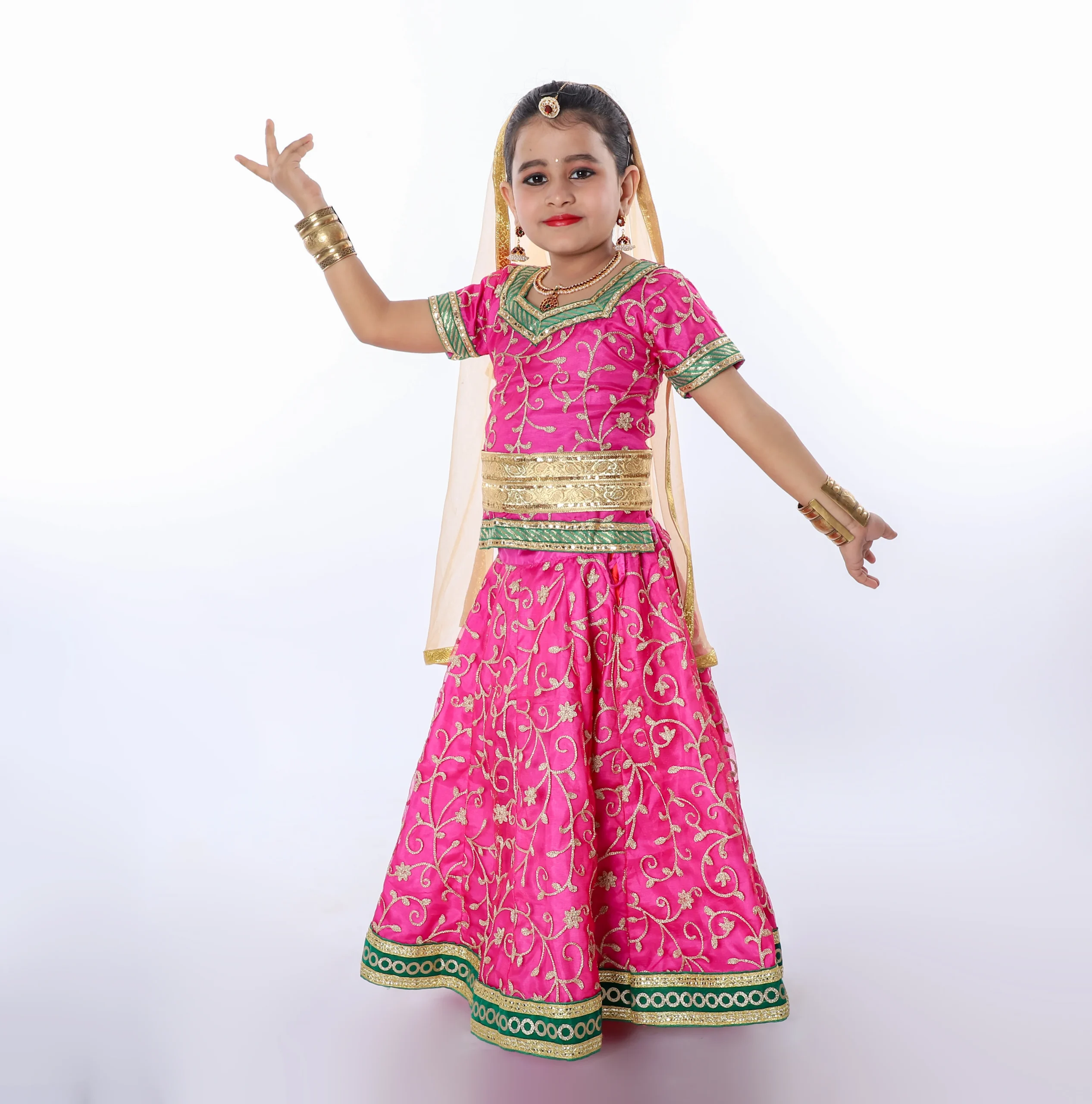 Beautiful Radha Rani Pink Lehenga Fancy Dress golden dupatta. This lehenga choli made for a girl and comfortable to wear girls. This lehenga choli comes Semi-stitch so you can be stitched according to your taste and preference. This costume is specially designed for girls and easily wear to play a role in school functions, fancy dress competition, Indian state theme competitions or role model presentation.