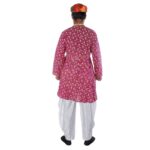 The costume includes a kurta paired with dhoti, which showcase Rajasthani craftsmanship and traditional work. Complemented by the colorful pagri (turban), this costume offers a regal and authentic Rajasthani look.