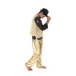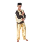 Buy Online Western Dance Dress in Golden and Black Color Costume for Boys. This dress is a combination of Heavy Satin Harem with Lycra Top and Zero Bindi Jacket. The costume is designed for boys to wear in school functions, western dance fancy dress competitions, dance competitions, and festivals.