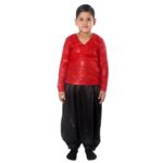 Buy Online Western Dance Dress in Red and Black Color Costume for Boys. This dress is a combination of Black Heavy Satin Harem with Red Zero Bindi Top. The costume is designed for boys to wear in school functions, western dance fancy dress competitions, dance competitions, and festivals.